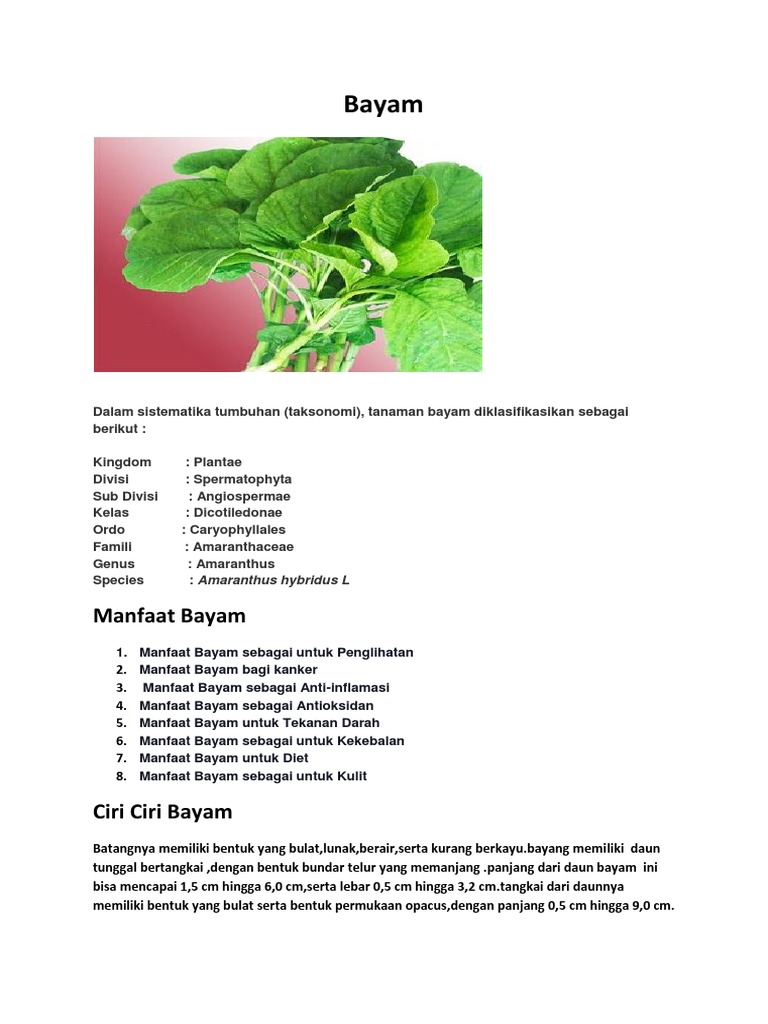 Bayam merupakan jenis tanaman dari genus Amaranthus yang banyak dikonumsi pada bagian daun. Daun tanaman sayur ini termasuk ke dalam daun tunggal bertangkai dengan warna daun sesuai pada jenisnya. Ciri ciri tanaman sayuran bayam.
